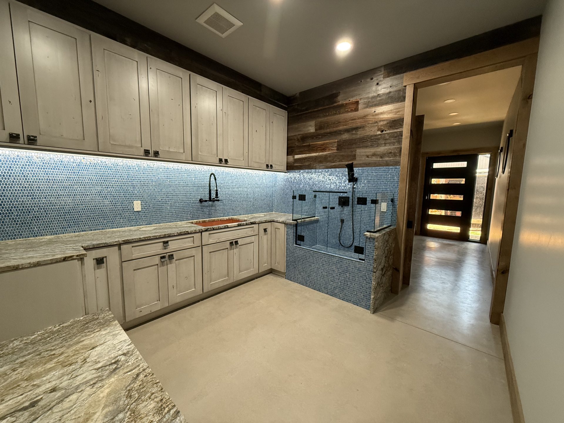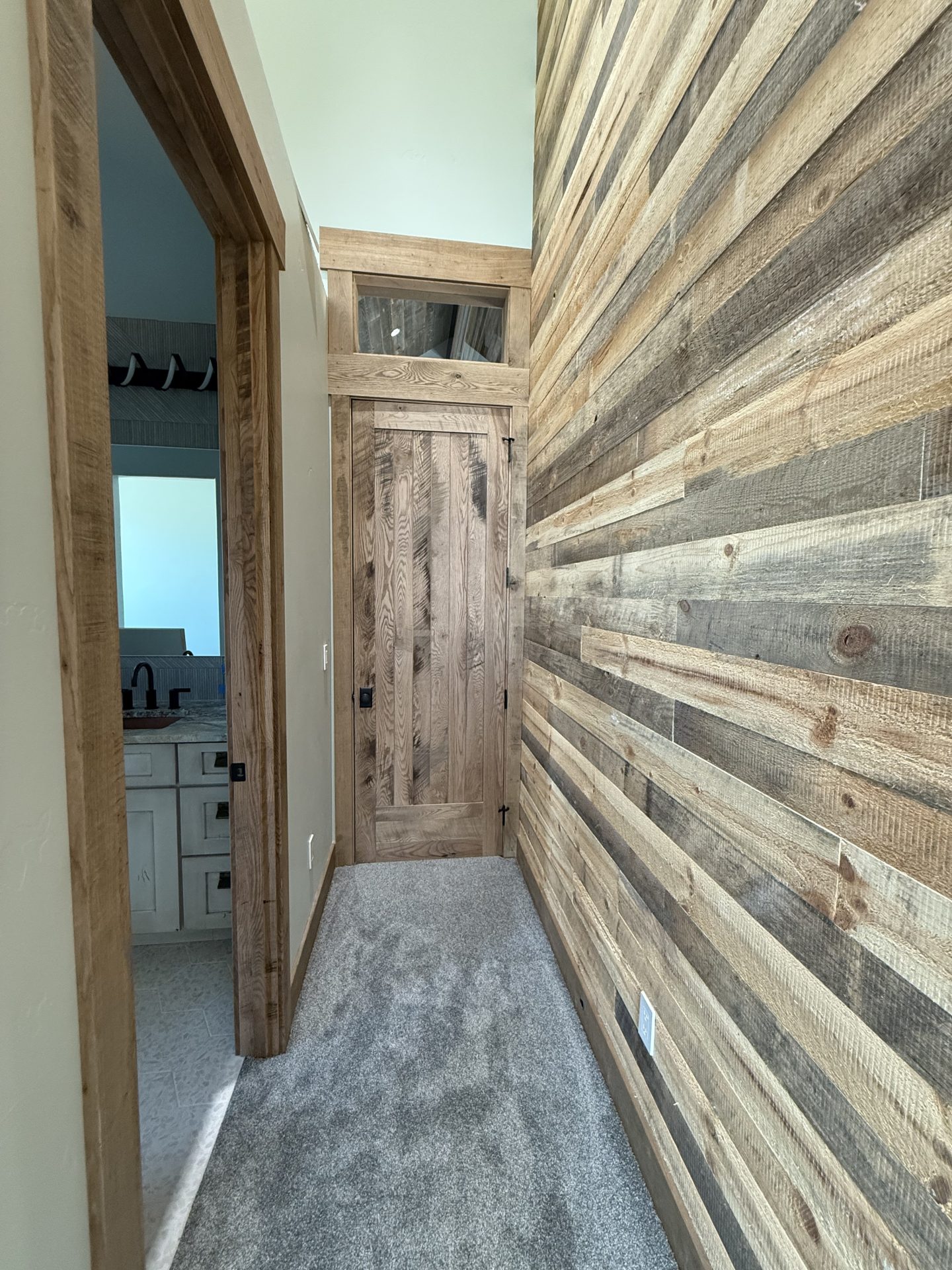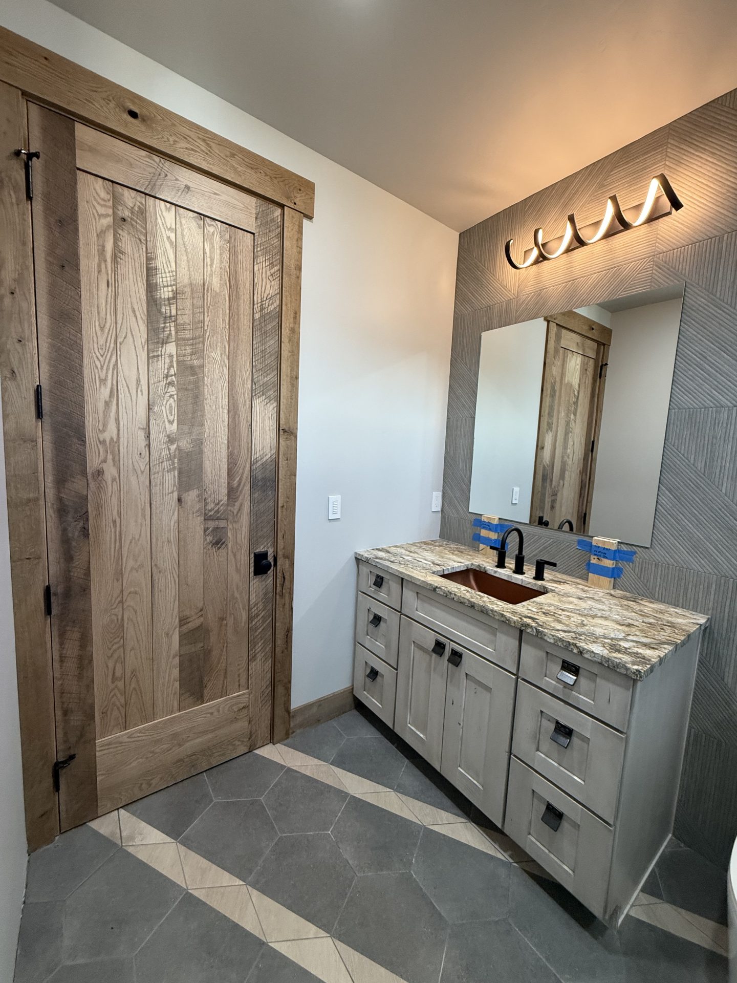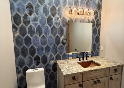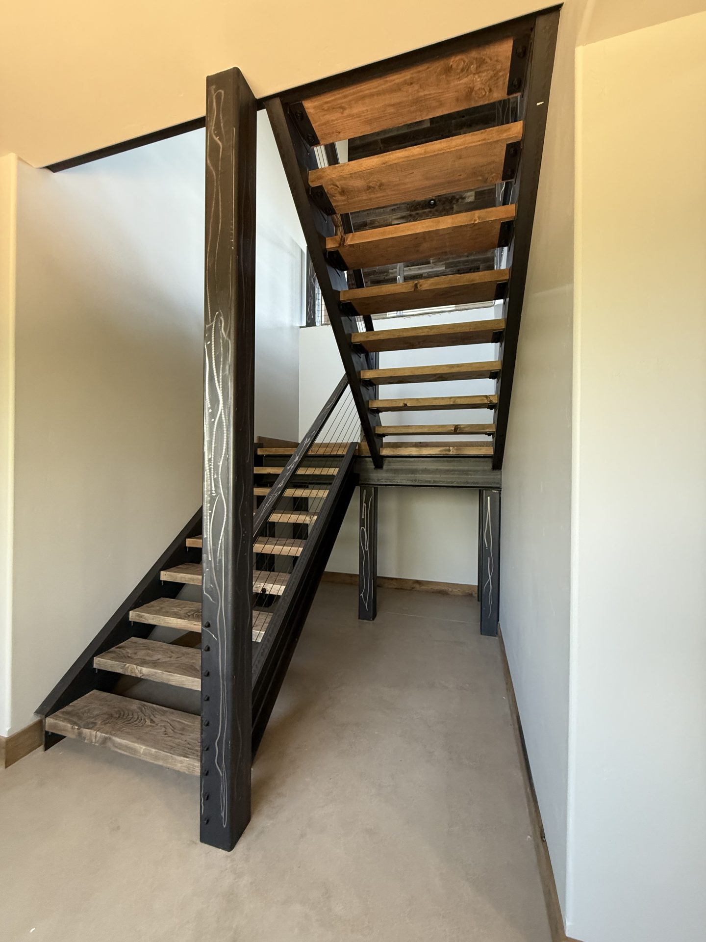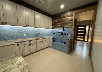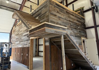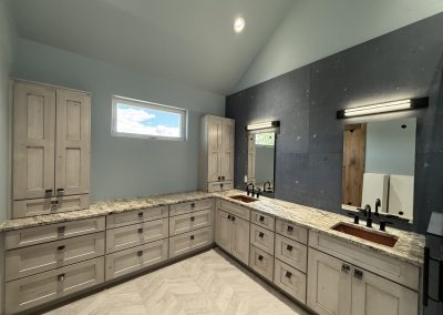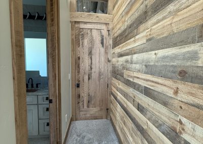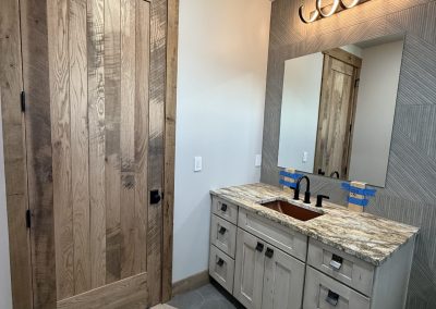 The design aesthetic was our signature style: Rustic Modern. High end cabinetry, granite with copper veins running through it, glass shower enclosures, the finest tile all blended together tastefully with rough sawn slab stair treads, exposed steel posts and beams and reclaimed barnwood feature walls and ceilings. We are thrilled with how this one turned out.