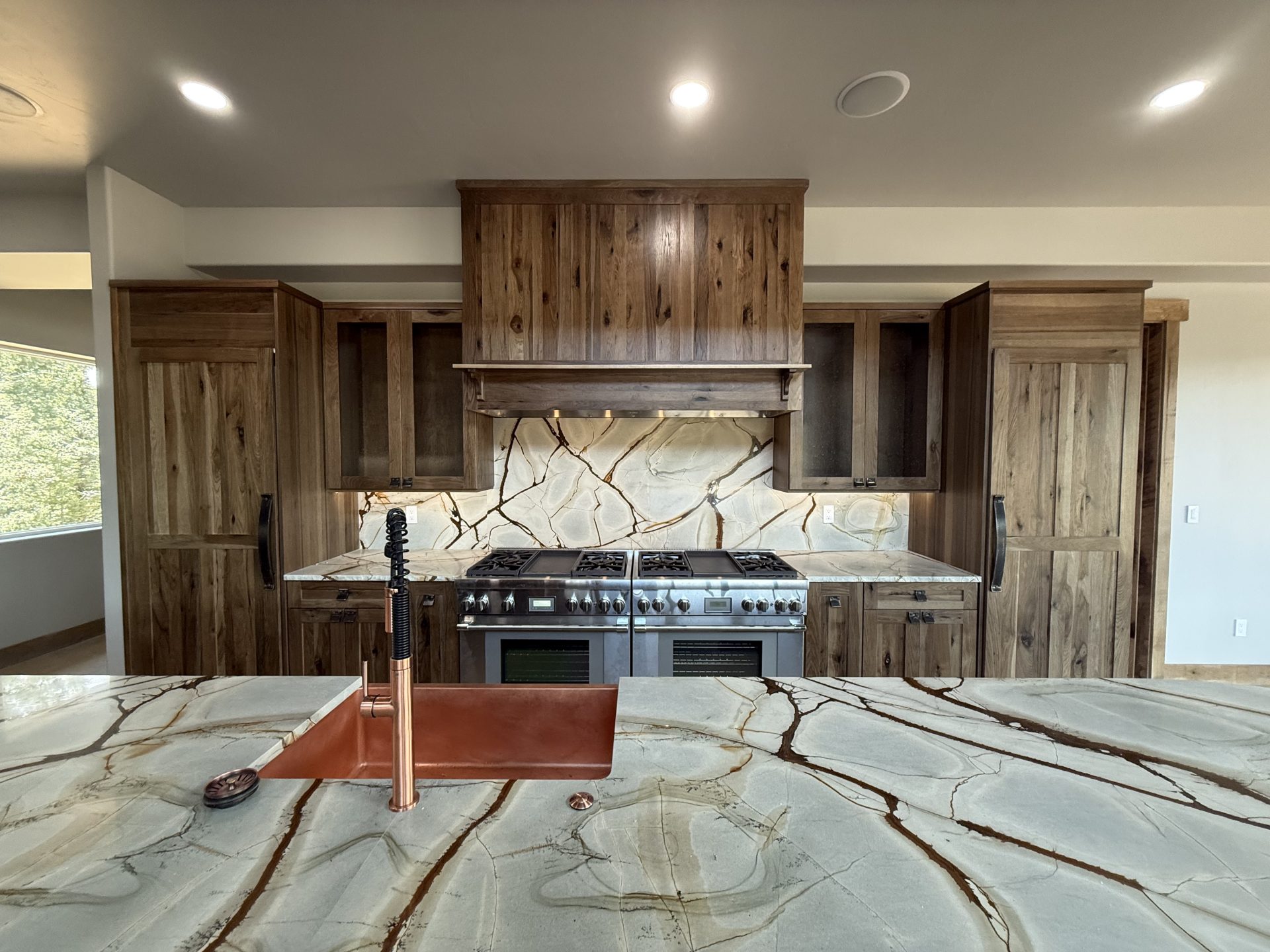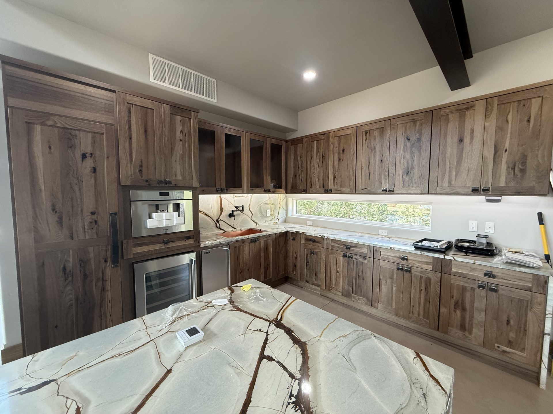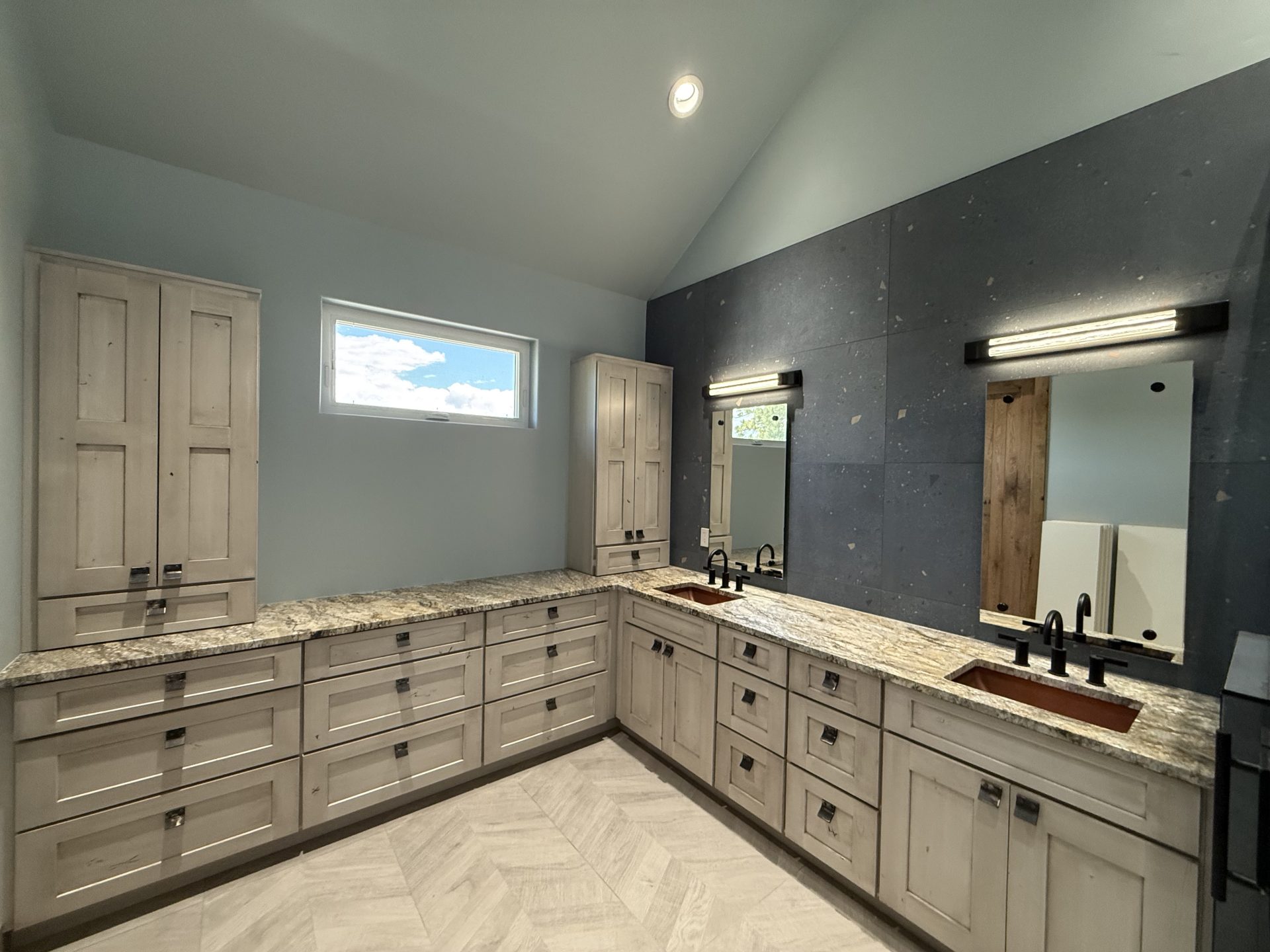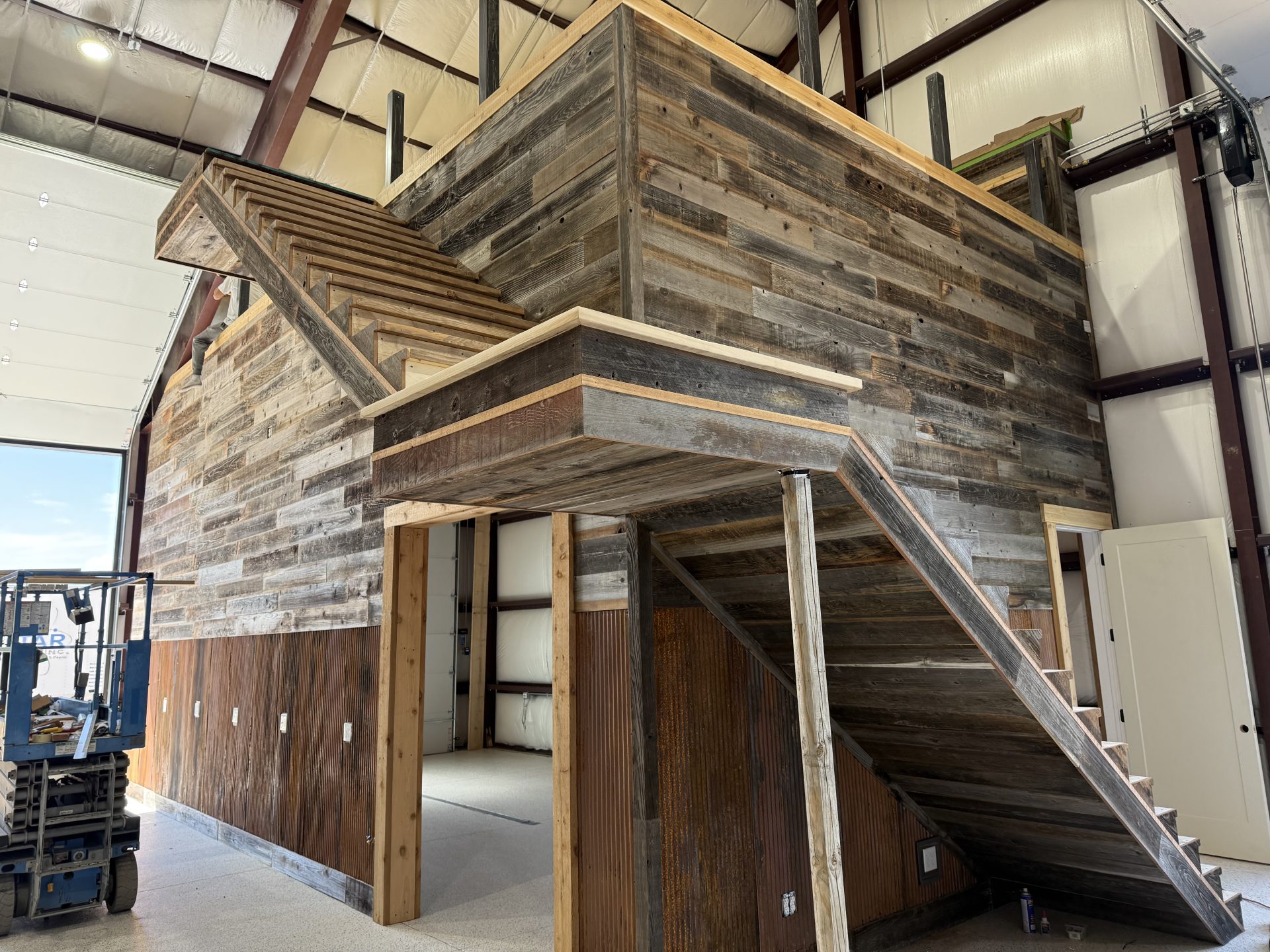 The design aesthetic was our signature style: Rustic Modern. High end cabinetry, granite with copper veins running through it, glass shower enclosures, the finest tile all blended together tastefully with rough sawn slab stair treads, exposed steel posts and beams and reclaimed barnwood feature walls and ceilings. We are thrilled with how this one turned out.